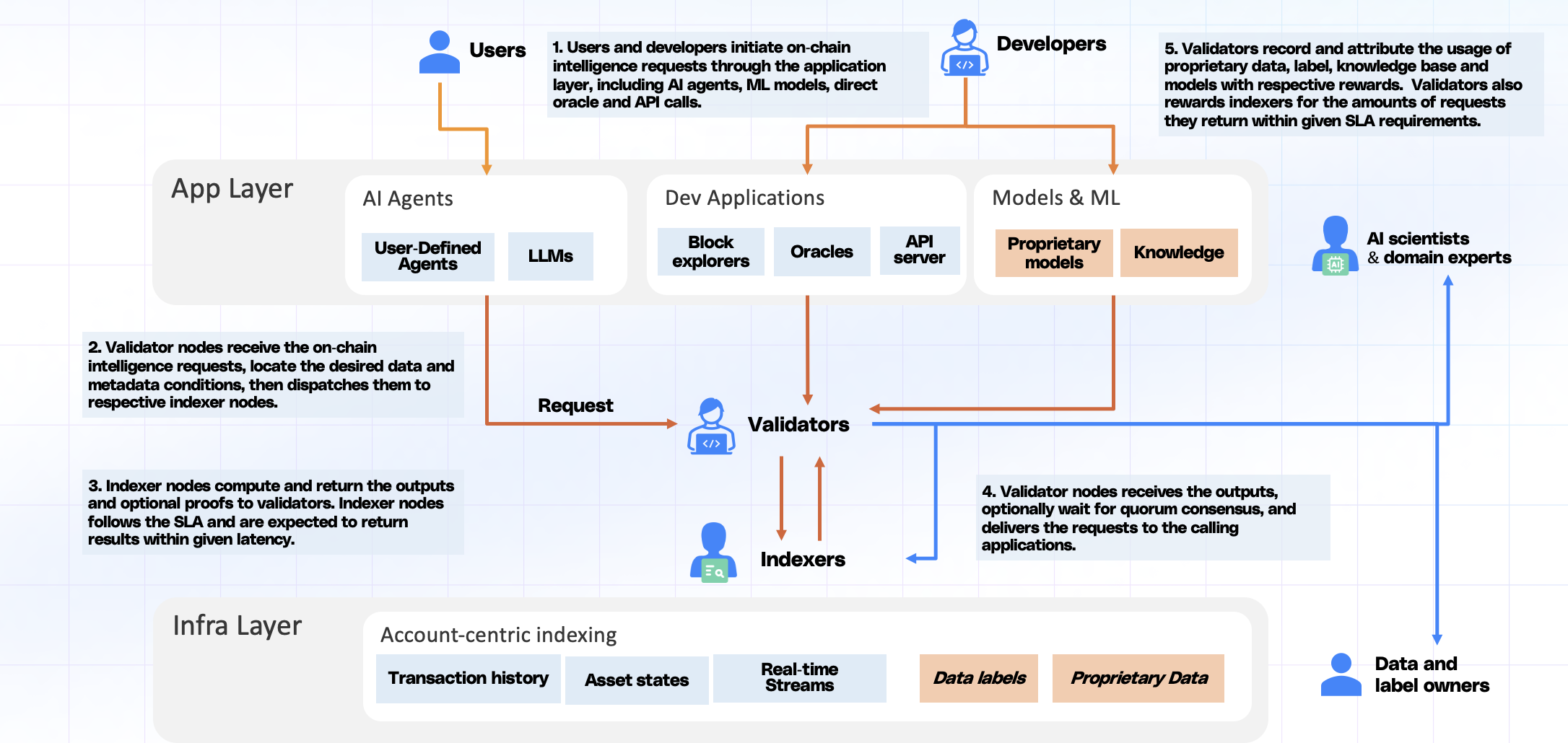 Indexers, Validators and Inference Nodes serve as the primary computing resource providers, offering crucial data and inference access to developers and servicing the network.